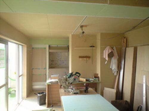 マンションスケルトンリフォーム「HK402」 大船駅で美味しそうなクロワッサンを差し入れとして、 15個ほど買い込み、現場へ。 大工工事も終盤。 残すところは、テレビカウンター、下足収納などの造作工事。 システムキッチンも搬入されていました。 内装屋…
