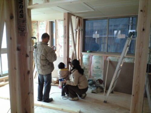 (click!) (1日1回クリックして頂けると嬉しいです。) クライアントご家族を現場へご案内。 順調すぎるほど順調な現場の進捗。 竣工引渡しが予定より早まりそうです。 今日は、柱や床下地が隠れる前に、 ご家族で記念の落書き大会! クレヨンで柱や床に書…