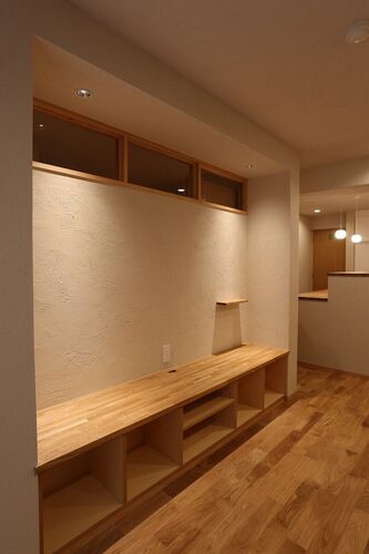 レコード好きのご主人。リビングの造作カウンターにテレビとレコードプレーヤー。カウンター下には、レコード収納。背景は、職人さんのコテ跡が美しい珪藻土仕上げをグレアレスダウンライトで照らしています。 アトリエ橙ホームページへ にほんブログ村