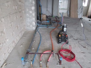 2014-08-28 スケルトンリフォーム「SA1308」現場報告 その2 上尾の現場へ。 解体工事が終了した後は、まず、床下の配管工事から行います。 給水管・給湯管・排水管・ガス管を敷設していきます。 このうち、一番太い管は、排水管ですので、 排水管のルート、勾配による設置高さにより、 二重床による床レベルが決まってきます。 先日の現場打ち合わせ通り、図面設定と変わらず、 スラブ+160ミリで施工することを確認いたしました。 今後、大工工事による乾式遮音二重床の工事に入っていく予定です。 (click!) 奥山裕生設計事務所