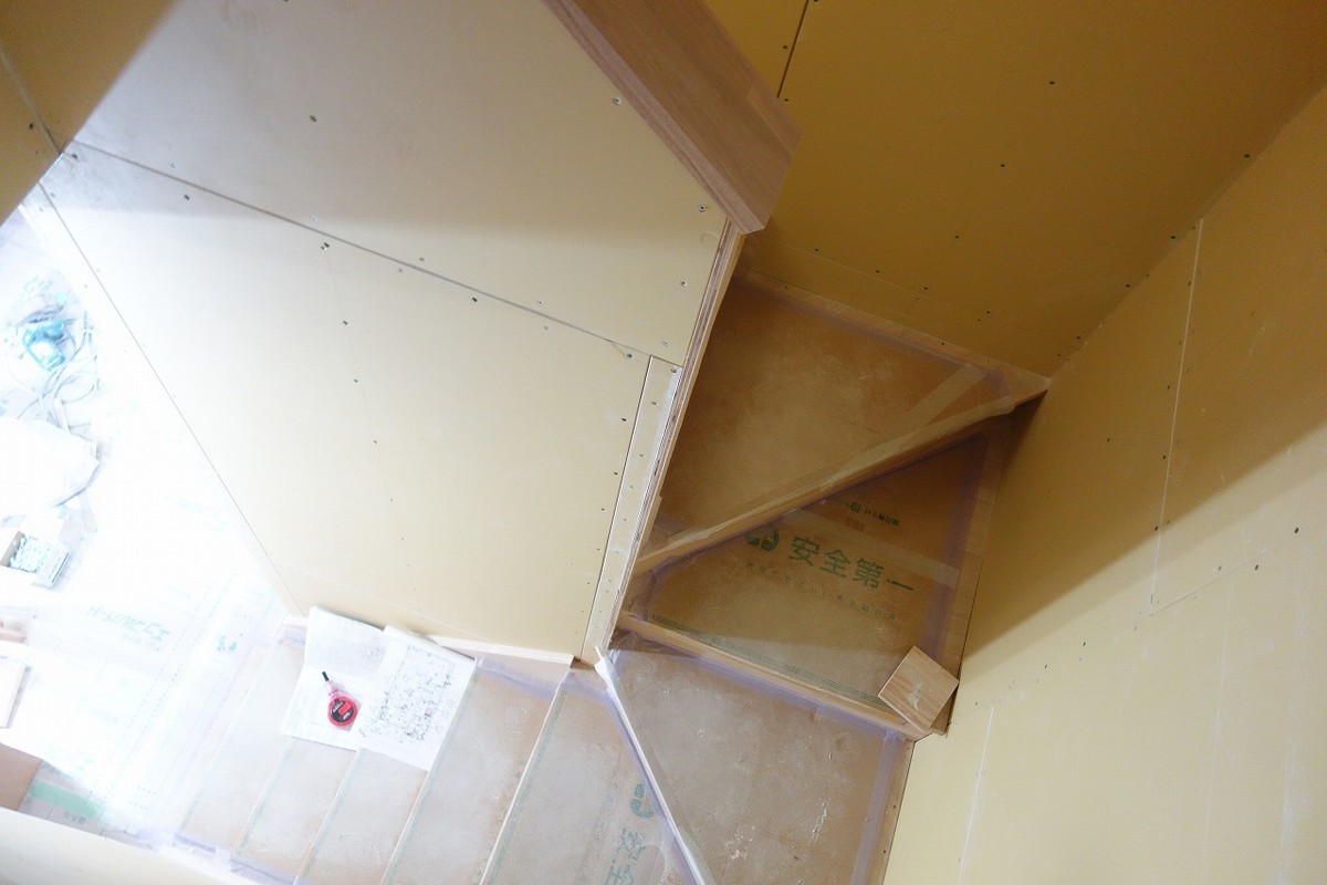 2階からロフトへの固定階段も完成し、ロフトへの行き来も楽になりました。ロフト(小屋裏収納)への階段は、行政指導によって、固定階段が可の場合と不可の場合があります。不可の場合は、ハシゴでの昇り降りとなります。建築基準法で定められていないことなので、各自治体の建築指導課の判断によります。自治体ごとで法解釈が異なるというのもおかしなことなのですが。「向原の家2」の板橋区は以前は不可だったのですが、いつの頃からか、固定階段可という判断になりました。ということで、今回は固定階段です。