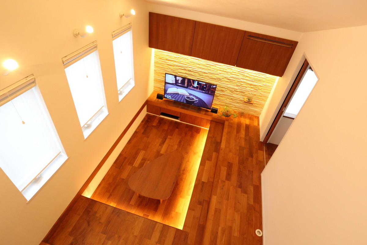サンクンリビングの床段差を利用して、間接照明をL字型に配置しています。