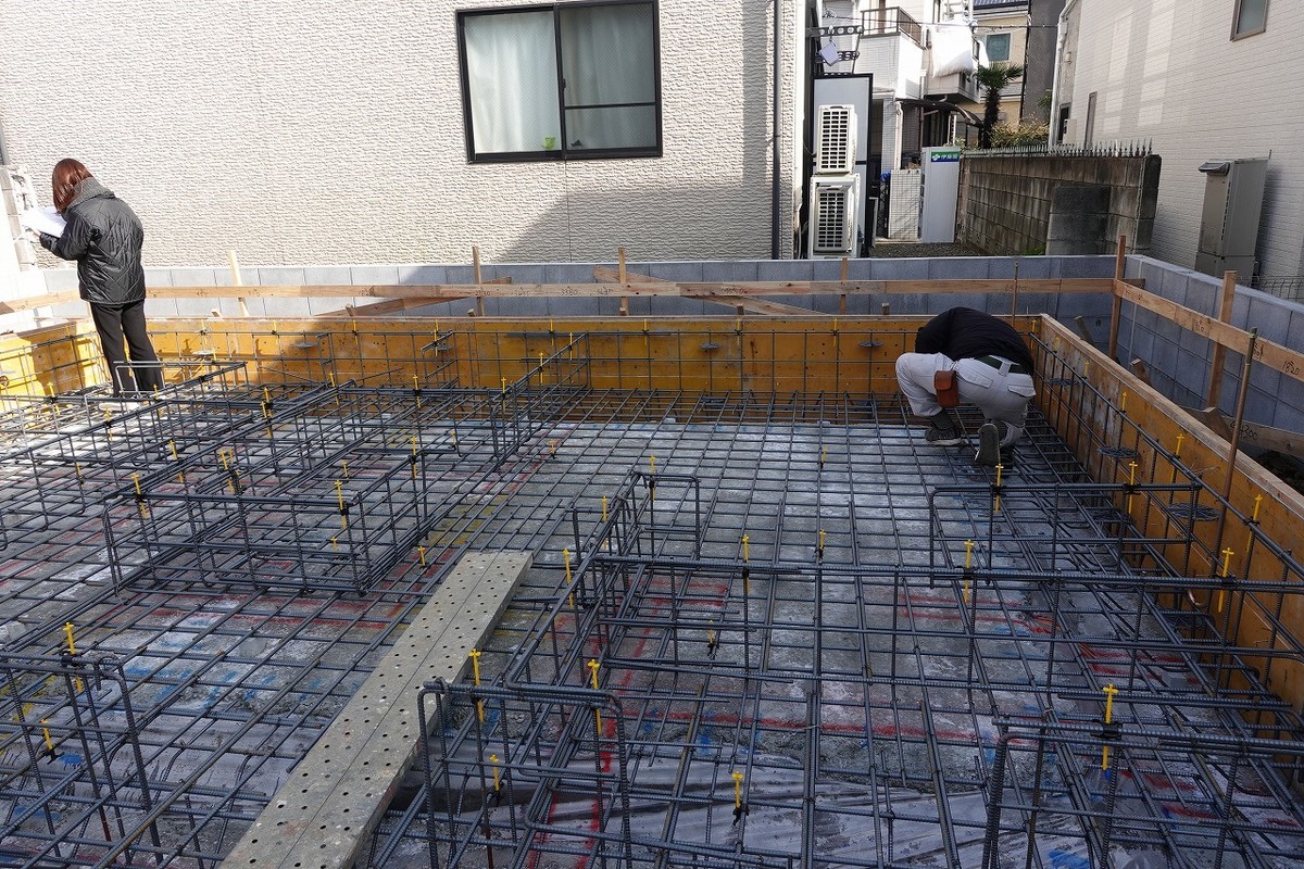 基礎コンクリート内の鉄筋のピッチ、種類、定着や継ぎ手(鉄筋の端同士が重なる部分のことです)の長さや金物の埋め込み深さなどが、構造計算や施工図通りに配筋されているか、ゴミなどが落ちていないかなどを計測しつつ確認します。