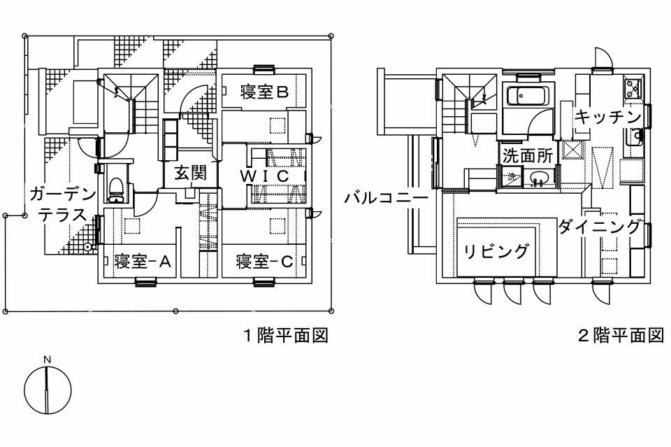 2階には、サンクンリビング、ダイニング、キッチン、浴室、洗面脱衣所、バルコニーを設けています。